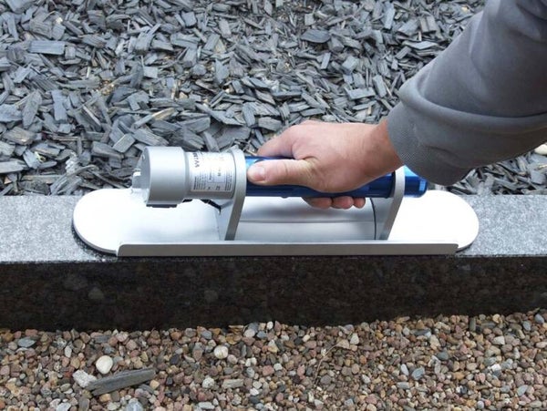 Der Alpha-Levator besteht aus einer stabilen Alu-Platte mit Griff. Eine Vakuumpumpe, die wahlweise mit Akku oder Netz betrieben wird, erzeugt den Unterdruck. Die Vakuumkammer auf der Unterseite wird über einen elastischen Gummi abgedichtet. Die Dichtung ist selbstklebend und kann einfach gewechselt werden.