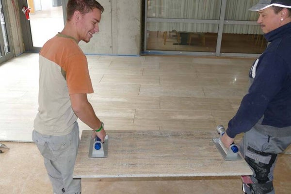 Der neue Vakuumheber mit Akku- oder Netzbetrieb Alle glatten / rauen und luftundurchlässigen Platten, wie z.B. Fliesen, Naturstein-, Betonplatten, Kunststoffe, Bleche oder Glas können mit dem Alpha-Levator auf einfache Weise gehoben werden: sofort nach dem Aufsetzen saugt sich die Platte fest, kann angehoben und transportiert werden.