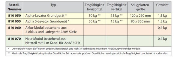 810 050 | Alpha-Levator Grundgerät * | 50 kg ** | 15 kg ** | 120 × 260 mm | 1,5 kg |