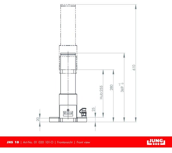 - Sehr große Hubhöhe: JHS 10 mit der Hebelasche 260 mm, mit der Kopfplatte maximal 610 mm.