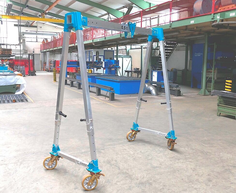 Schnell montierbar und auf ebenem, festem Boden leicht verfahrbar. Träger und Stützen sind aus Aluminium gefertigt; daher hat das Vierbein ein geringes Eigengewicht. Die lichte Breite und die Höhe des Kranes können mit Steckbolzen verstellt werden.