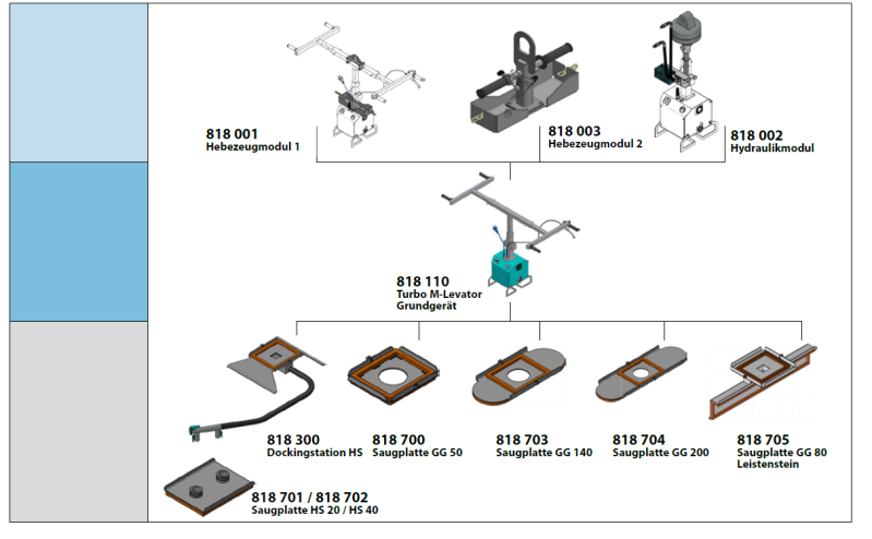 Technik: der Tubi-Levator besteht aus einem fahrbaren Gehäuse mit der Saugturbine. Die Saugturbine erzeugt den Unterdruck und wird mit dem Saugschlauch mit der gewünschten Saugplatte verbunden. Die Vakuumkammer der Saugplatte wird durch einen elastischen Gummi abgedichtet. Die Dichtung ist selbstklebend und kann einfach gewechselt werden.