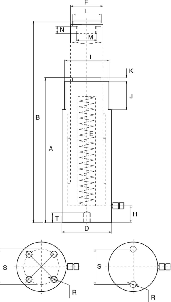 Standardzylinder für allgemeine Industriezwecke. Für Arbeiten in allen Positionen konstruiert. Zur leichten Befestigung mit Gewinde außen am Zylinder, am oberen Teil des Kolbens und an der Bodenplatte ausgerüstet.