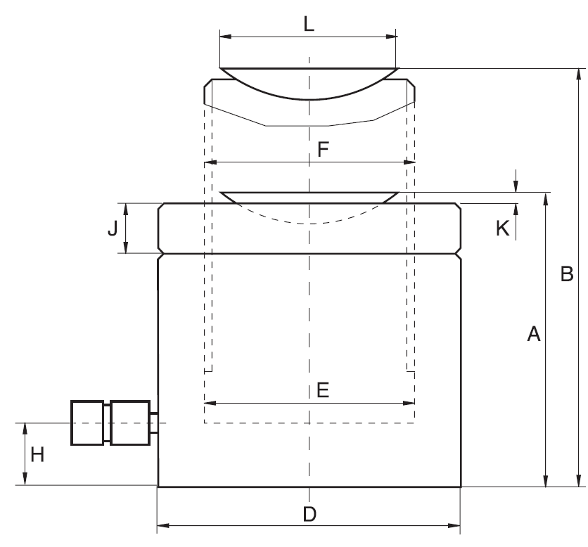 | Modell | Tragkraft (t) | Druck (kN) | Hub (mm) | Ölvolumen (cm³) | A (mm) | B (mm) | D (mm) | E (mm) | F (mm) | H (mm) | J (mm) | K (mm) | L (mm) | Fläche (cm²) | Gewicht (kg) |