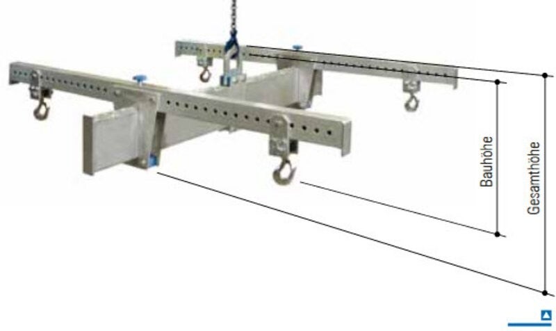 Mit vier verstellbaren Sicherheitslasthaken, welche unter Last um 360° drehbar sind.