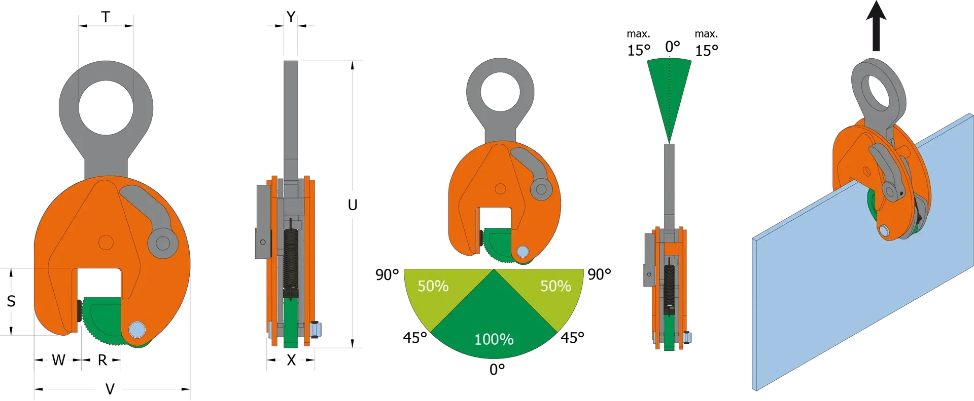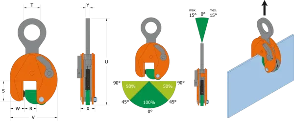 Modell | Tragfähigkeit [kg] | Maulbreite [mm] | S [mm] | T [mm] | U [mm] | V [mm] | W [mm] | X [mm] | Y [mm] | Gewicht ca. [kg/Stk.] |