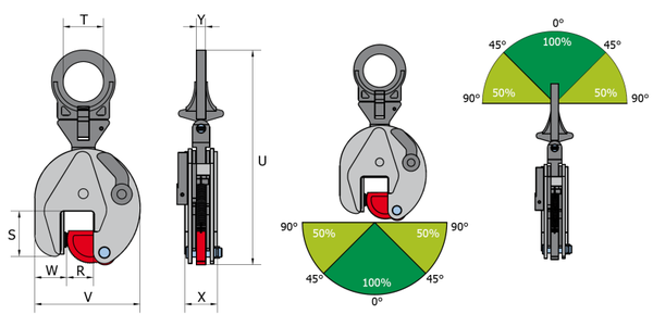 Modell | Tragfähigkeit [kg] | Maulbreite [mm] | S [mm] | T [mm] | U [mm] | V [mm] | W [mm] | X [mm] | Y [mm] | Gewicht ca. [kg/Stk.] |