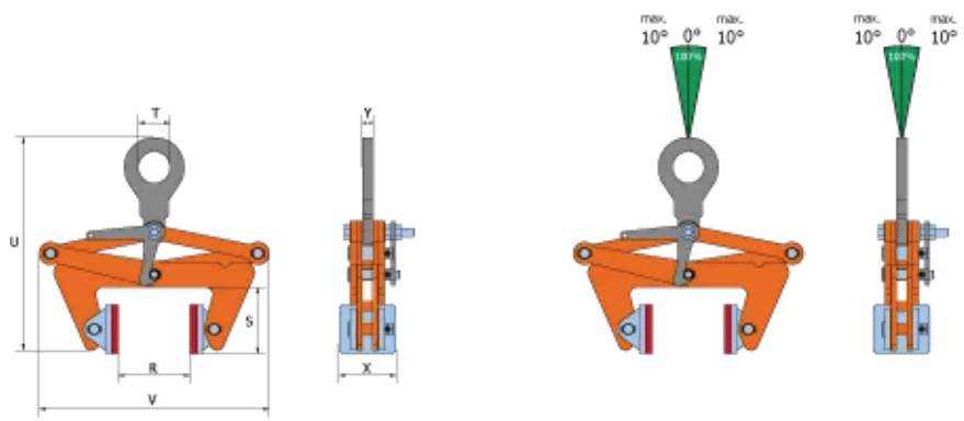 | Modell | Art.Nr. | Belastbarkeit (kg) | Maulbreite (mm) | S (mm) | T (mm) | U min-max (mm) | V min-max (mm) | X (mm) | Y (mm) | Gewicht ca. (kg) |